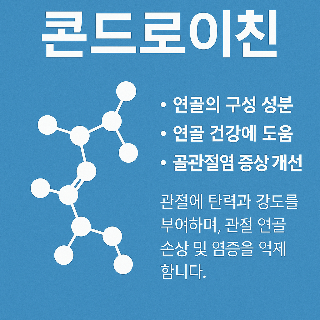 콘드로이친은 단순한 관절 보충제가 아니라, 연골 구조를 보호하고 통증을 완화하며 삶의 질을 높이는 핵심 성분입니다. 글루코사민이나 MSM, 콜라겐과 함께 병용하면 더욱 효과적이며, 무엇보다 꾸준함이 중요합니다.