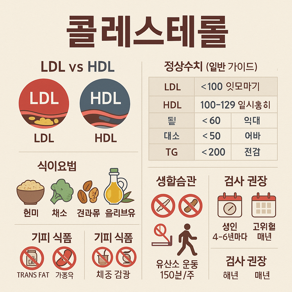 콜레스테롤은 우리 몸에서 중요한 역할을 하지만, 수치가 높아지면 심혈관 질환, 고지혈증, 뇌졸중 등 다양한 건강 문제를 유발할 수 있습니다. 특히 중장년층과 직장인, 여성 갱년기 등 특정 타겟층에서는 콜레스테롤 수치 관리가 건강 유지에 핵심입니다. 2025년 현재, 콜레스테롤 관리법은 단순한 약 복용을 넘어서 식단 조절, 운동 습관, 정기적인 자가 진단까지 통합적으로 접근하는 것이 중요합니다. 이 글에서는 효과적인 콜레스테롤 관리법을 식단, 운동, 약물, 자가진단 네 가지 측면에서 구체적으로 살펴보겠습니다.